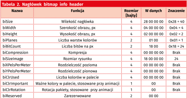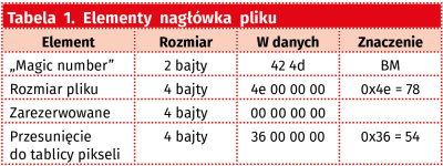 Uzyskany wynik (już ręcznie sformatowany do trochę innej postaci) został pokazany na listingu 2. Zaraz dowiemy się, dlaczego bajty zostały pogrupowane w taki sposób. Pierwsze 14 bajtów stanowi nagłówek pliku. Ich znaczenie zostało opisane w tabeli 1. Pierwsze dwa z nich to tak zwany magiczny numer (magic number). Pozwalają one rozpoznać rodzaj pliku. Dla bitmapy są to 0x42 i 0x4d, co w kodzie ASCII oznacza litery BM.