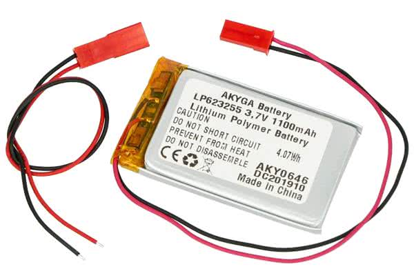 Akumulator marki Akyga został wykonany z ogniw Li-Pol (litowo-polimerowych) o napięciu znamionowym 3,7 V i pojemności 1100 mAh [4]. Cechuje go duża gęstość energii, niewielkie wymiary, mała masa i powolne samorozładowywanie. Akumulator jest wyposażony w przewód o długości 150 mm zakończony 2-pinowym złączem JST typu żeńskiego (raster 2,54 mm).