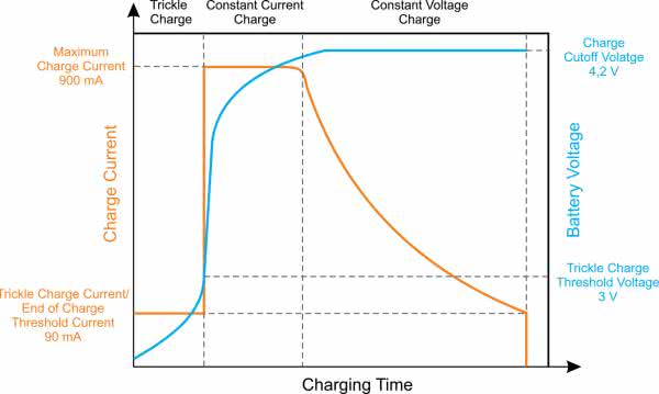 Ładowanie podtrzymujące. Ponieważ rezystancja wewnętrzna akumulatora litowego staje się wysoka, gdy napięcie jest niskie, ładowanie dużym prądem na początku nie jest dobrym sposobem. W takich warunkach temperatura akumulatora wzrasta, a żywotność baterii spada. Gdy napięcie akumulatora (doprowadzone do wejścia FB) jest niższe niż napięcie progowe ładowania podtrzymującego wynoszące 3 V, moduł przechodzi w fazę ładowania podtrzymującego, ładując akumulator prądem wynoszącym 10% maksymalnego prądu ładowania (do 90 mA), aż do momentu, gdy napięcie akumulatora będzie wyższe niż 3 V.