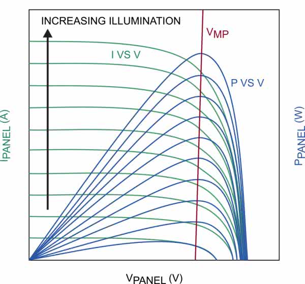 Algorytm śledzenia maksymalnego punktu mocy MPPT (Maximum Power Point Tracking) może zapewnić dostarczanie przez panel słoneczny maksymalnej moc wyjściowej przy różnych obciążeniach i przy różnych poziomach światła słonecznego. Możemy określić prąd zwarciowy ISC oraz napięcia otwartego układu VOC z przecięcia punktów krzywej wykresu I/V (zielony). Wartości ISC i VOC rosną wraz ze wzrostem poziomu oświetlenia. Wraz ze wzrostem napięcia wyjściowego VPANEL prąd wyjściowy IPANEL stopniowo maleje, a następnie spada w dół w sposób określony przez specjalne punkty VMP, maksymalnej mocy. Mnożąc napięcie i prąd, co daje moc, i przyjmując napięcie wyjściowe jako oś x, otrzymujemy krzywą P/V (kolor niebieski). Moc wyjściowa PPANEL osiąga szczyt, gdy napięcie wyjściowe wynosi VMP.