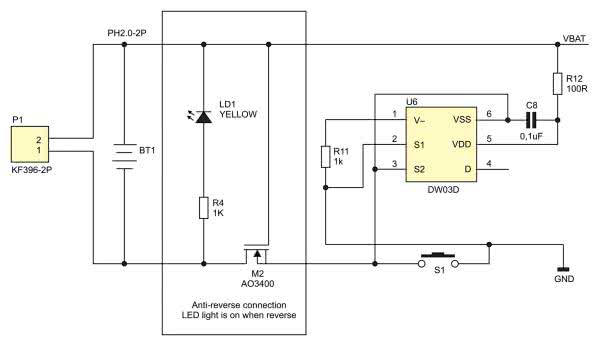 W ten sposób układ kontroluje przepływ prądu i umożliwia odłączenie akumulatora od modułu. Układ DW06D zabezpiecza akumulator litowy przed przeładowaniem (4,3 V, próg 4,1 V), nadmiernym rozładowaniem (2,5 V, próg 2,9 V), odwrotnym podłączeniem oraz nadmiernym prądem (3 A).