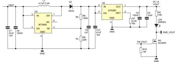 Napięcie to jest podawane na układ przełącznika zasilania SY6280 (U2) o niskim spadku napięcia (Ron=80 mΩ). Układ dostarcza napięcie wyjściowe VOUT 5 V 1 A dołączone do gniazdka „USB OUT” typu USB-A. Układ SY6280 ma funkcję ograniczania prądu wyjściowego. Poziom ograniczenia jest ustawiany zewnętrznym rezystorem R7 według wzoru Ilim=6800/R7. Dla zamontowanego na module rezystora oznacza to ograniczenie do ok. 1 A prądu.