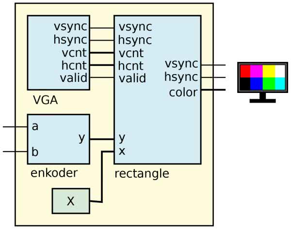 Współrzędne określające położenie są zapisywane w rejestrach, gdy aktywny jest sygnał synchronizacji pionowej (czyli w stanie niskim). Dzięki temu położenie figury nie zmieni się w środku ramki. Wymiary prostokąta są określone przez dwie stałe: H (pozioma) i V (pionowa). Cztery komparatory sprawdzają, czy obecnie przetwarzany piksel o współrzędnych hcnt i vcnt należy do prostokąta. Na tej podstawie multiplekser wybiera, czy na wyjście zostanie podany kolor czarny (wektor zerowy), czy zdefiniowany przez stałą color. Wyjście modułu zatrzaśnięte jest w przerzutnikach. Sygnały synchronizacyjne po prostu „przepływają” przez moduł. Dzięki temu mają takie samo opóźnienie, jak sygnał mówiący o kolorze.