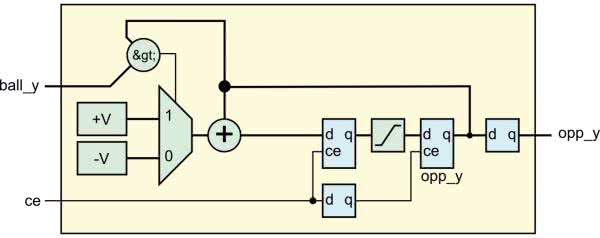 Oponent, podobnie jak gracz, wykonuje ruch jedynie w osi pionowej. Rejestr opp_y przechowuje jego obecne położenie. W każdym kroku symulacji (czyli dla każdej ramki) ma on dwie możliwości: ruch w górę, albo w dół o V pikseli. Decyzję o kierunku podejmuje komparator porównujący obecną pozycję z położeniem piłki. Ostatnim krokiem obliczeń jest saturacja. Sprawdzamy tu, czy nowa pozycja mieści się na ekranie. Jeżeli nie, wpisujemy skrajne górne, albo dolne położenie. Na końcu wynik zatrzaskujemy jeszcze w dodatkowym rejestrze.