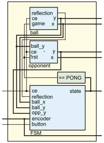 Samą maszynę stanów znajdziemy na listingu 6. Jak zwykle zaczynamy od resetu. Następnie w instrukcji case wykonujemy akcje dla kolejnych stanów. Dla stanu PONG korzystamy z sygnału reflection zwracanego przez moduł piłki. Informuje on, że nastąpiło odbicie i należy sprawdzić, czy rozgrywka się nie zakończyła. Sposób połączenia maszyny stanów z pozostałymi modułami pokazuje rysunek 5. Wejściami modułu jest informacja o nowej ramce (ce) oraz pozycja gracza (encoder) oraz stanie przycisku (button). Wyjściem są natomiast położenia piłki, przeciwnika i gracza oraz aktualny stan.