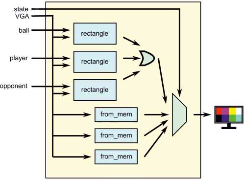 Przygotowaliśmy już logikę gry. Dzięki temu, że jest oddzielona od generowania obrazu mogliśmy ją łatwo przetestować. Teraz zostało nam jeszcze przygotowanie GUI. Użyjemy przygotowanych wcześniej modułów: wyświetlania prostokąta oraz bitmapy. Uproszczony schemat prezentuje rysunek 7. Wejściem są: stan, pozycje paletek i piłki oraz sygnały synchronizujące z modułu VGA. Za generowanie obrazu rozgrywki odpowiadają trzy „prostokąty”. Tak jak poprzednio ich wyjścia kolorów są sumowane za pomocą instrukcji lub. Dodatkowo używamy trzech modułów from_mem. Wyświetlą one trzy ekrany: startowy oraz informujące o zwycięstwie albo przegranej.
