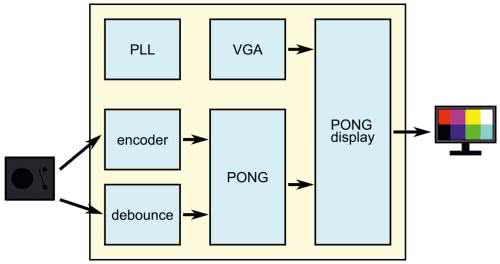 Ostatnim krokiem, który dzieli nas od rozgrywki jest integracja wszystkich modułów. Uproszczony schemat prezentuje rysunek 9. Moduły encoder i debounce obsługują sterowanie od użytkownika. Przekazują one parametry do modułu PONG. Równolegle działa moduł VGA. Ostatnia część PONG display odbiera od nich sygnały i generuje odpowiedni obraz. Włączamy program Quartus. Ładujemy projekt rectangle.qpf. Jako moduł top wybieramy pong_top.sv. Uruchamiamy budowę. Programujemy płytkę i gramy. Uzyskany efekt możemy zobaczyć na fotografii 1 oraz pod koniec filmu [2].