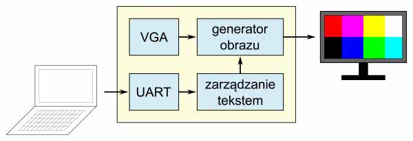 Koncepcja terminala znakowego została pokazana na rysunku 1. Składa się on z czterech bloków. Dwa z nich już znamy: moduły obsługi portu szeregowego oraz generator sygnału VGA.