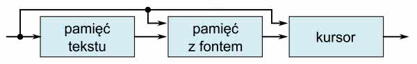 Uproszczony schemat modułu generowania obrazu został pokazany na rysunku 2. Składa się on z dwóch pamięci. Pierwsza z nich, dwuportowa pamięć RAM przechowuje tekst, a druga – pamięć ROM, przechowuje czcionkę (font). Na końcu znajdziemy jeszcze moduł odpowiedzialny za wyświetlenie kursora.