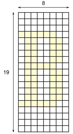 Pojedynczy wiersz tablicy font opisuje jeden znak. Jest on listą, gdzie pierwszy element oznacza kod znaku w standardzie ASCII, a zapisana na końcu tablica 19 zmiennych 1-bajtowych opisuje kolejne wiersze. W zrozumieniu co one dokładnie oznaczają pomoże nam rysunek 4.