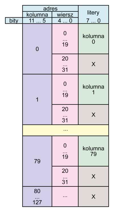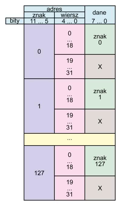 Słowo w pamięci ma długość 8 bitów i odpowiada pojedynczemu wierszowi. Adres składa się z dwóch części: