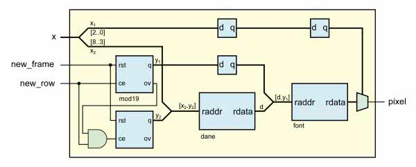 Sprawa ma się gorzej dla osi pionowej. Wysokość jednego znaku to 19 pikseli. Operacja dzielenia przez stałą jest syntezowalna, ale spróbujemy prostszego rozwiązania: zrobimy zestaw liczników zliczających kolejne wiersze: pierwszy z nich liczący modulo 19 pokazuje pozycję w znaku. Drugi wyzwalany przepełnieniem poprzedniego liczy wiersze tekstu. Pierwszym krokiem jest oczytanie odpowiedniego znaku z pamięci danych. Składamy więc adres korzystając z starszych części pozycji x i y tworząc wektor: [x2,y2]. Pozwoli on odczytać kod ASCII znaku. Pamięć (oraz cały nasz moduł) działają przepływowo. Wynik będzie dostępny na wyjściu w następnym cyklu zegara. Razem z numerem kolumny y1 posłuży on do zaadresowania pamięci fontu. Jednak aby dane były poprawne musimy wyrównać jego opóźnienie dodając rejestr. Ostatnim krokiem jest wybranie piksela z odczytanego wiersza. Tutaj użyjemy multipleksera sterowanego trzema młodszymi bitami położenia w poziomie: x1.