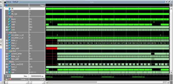 Zostaje nam połączenie nowego modułu z generatorem sygnału VGA. Znajdziemy je w pliku 17_terminal/terminal_show_top.sv. Najpierw sprawdzimy jego działanie w symulacji. Użyjemy naszego monitora portu VGA. Uruchamiamy program Questa i wywołujemy polecenie: