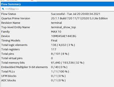 Możemy przejść do ostatniego kroku. Uruchamiamy środowisko Quartus i budujemy projekt 17_terminal/terminal.qpf. Warto przyglądnąć się zużyciu zasobów, zaprezentowanemu na rysunku 12. Widzimy, że zajętych jest 61440 bitów pamięci RAM, choć w projekcie mamy dwie pamięci składające się z 4096 ośmiu bitowych słów.