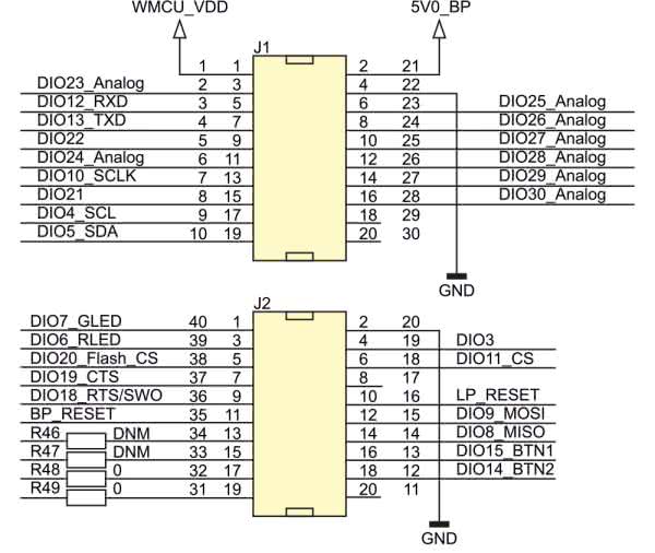 Na złączach J1 oraz J2 zestawu startowego CC1352R1 LaunchPad jest udostępnionych 26 wyprowadzeń – wejścia-wyjścia (GPIO) układu scalonego CC1352 P oznaczone jako „DIOxx”, gdzie xx to numery od 01 do 31 (rysunek 9) [5]. Występuje pewien konflikt sterowania diodami LED zamieszczonymi na obu płytkach. Można temu zaradzić poprzez zdjęcie zworek P6 na płytce zestawu CC1352 P-4 LaunchPad [S15].