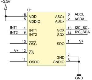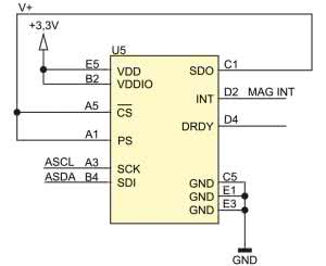 BMI160 ma dodatkowy interfejs I2C do podłączenia dodatkowych czujników Bosch, takich jak czujnik geomagnetyczny BMM150 (rysunek 6). Wyjście cyfrowe obu czujników jest przesyłane przez 2-przewodowy interfejs szeregowy zgodny z I2C i SMBus. Układ BMI160 podczas pracy pobiera do 900 μA prądu i tylko 3 μA (typ.) w trybie zawieszania. Dlatego dołączony jest na stałe do linii zasilania zestawu, a kluczowanie trybu pracy odbywa się na drodze programowej.
