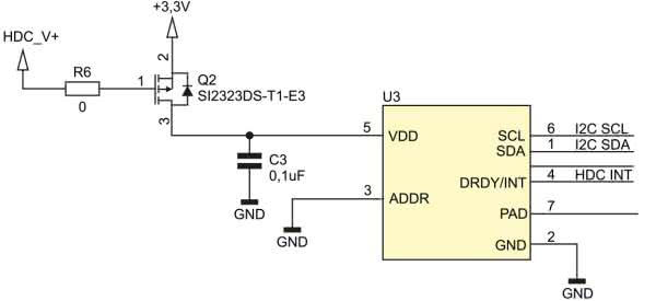 Układ scalony HDC2080 pobiera w trakcie pomiaru wilgotności 890 μA (max.) prądu i 730 μA (max.) prądu w trakcie pomiaru temperatury. Dlatego jego zasilanie jest kluczowane poprzez tranzystor MOS sterowany z osobnej linii GPIO (rysunek 4).