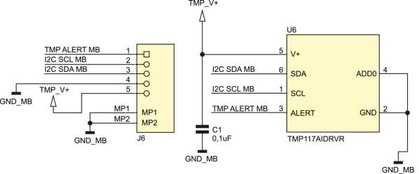 Należy zwrócić uwagę, że takie dołączenie płytki czujnika powoduje odwrócenie kolejności sygnałów na złączach (rysunek 2). Czujnik TMP117 pobiera w trakcie pomiaru 220 μA (max.) prądu, dlatego jest zasilany bezpośrednio z wyprowadzenia GPIO służącego również do kluczowania zasilania (czas resetu 1,5 ms).