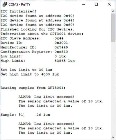 Najpierw otwieramy sesję terminalu (np. PuTTY, itp.) do odpowiedniego portu COM z ustawieniami 115200, 8, 1, N. Następnie uruchamiamy przykład. Dioda LED włącza się, aby wskazać, że inicjalizacja sterownika I2C została zakończona. W razie potrzeby czujnik jest włączany za pomocą wyjścia GPIO.