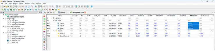 Po przeprowadzeniu syntezy, otwórz narzędzie Spreadsheet i skonfiguruj piny tak, jak pokazano na rysunku 6. Zwróć uwagę, że przyciski mają włączoną dużą histerezę – w kolumnie HYSTERESIS jest ustawiona wartość LARGE. Przyciski enkoderów na płytce User Interface Board mają filtry RC w celu odszumiania drgań styków mechanicznych. Sygnał doprowadzony do pinów FPGA jest wolnozmienny, a dodanie histerezy pozwala odczytywać stan przycisku bez usuwania tych drgań innymi metodami.