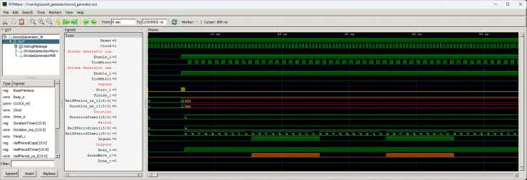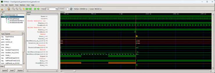 Dźwięk o częstotliwości 50 kHz ma okres 20 µs, zatem jego półokres to 10 µs. Moduł wymaga podania półokresu pomniejszonego o 1 i dlatego w linii 3 do zmiennej HalfPeriod_us wpisujemy wartość 9. Ostatnią czynnością jest ustawienie wejścia Start_i w stan wysoki (linia 4), aby poinformować moduł SoundGenerator, że na swoich wejściach ma istotne dane i powinien rozpocząć pracę.