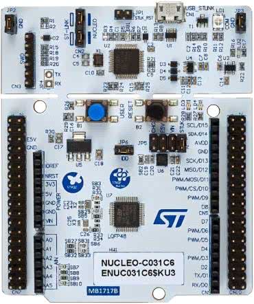 Kurs został zaplanowany z myślą o możliwie najniższych nakładach finansowych, związanych z zakupem sprzętu niezbędnego do realizacji opisanych zadań. Dlatego też wybór padł na jedną z nielicznych (ale łatwo dostępną także w Polsce) płytek ewaluacyjnych dla nowej rodziny procesorów STM32. Mowa o zestawie NUCLEO-C031C6 (fotografia 2), który – wbrew przyjętej przez ST nomenklaturze – wprawdzie bazuje na rozmiarze płytki znanym dotąd z układów w obudowach 64-pinowych, ale w istocie jest wyposażony w układ 48-nóżkowy. Niestety, wiążą się z tym pewne ograniczenia pod względem kompatybilności z niektórymi nakładkami funkcjonalnymi z serii Nucleo.
