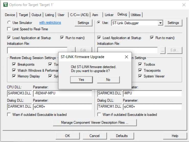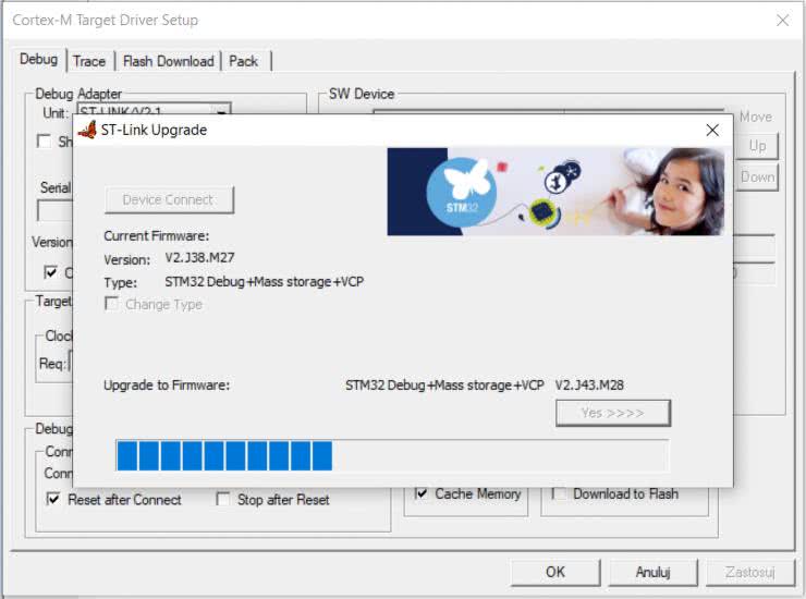 Kolejnym etapem konfiguracji jest ustawienie programatora/debuggera – w tym celu wybieramy przycisk Options for Target (rysunek 8), a w otwartym oknie, w zakładce Debug, ustalamy rodzaj interfejsu jako ST-Link Debugger (rysunek 9) i klikamy znajdujący się obok przycisk Settings. Program zapyta nas prawdopodobnie o chęć aktualizacji firmware’u programatora – potwierdzamy wybór przyciskiem Yes, przechodząc w ten sposób do okna aktualizacji (rysunek 10). Tutaj również wyrażamy zgodę na aktualizację, uprzednio wydając programowi polecenie połączenia się ze sprzętem (Device Connect, a następnie Yes >>>>).