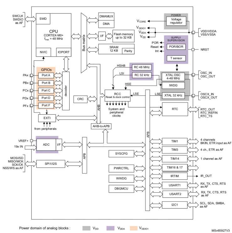 Schemat blokowy naszego bohatera można zobaczyć na rysunku 11. Układ zawiera 32 kB pamięci Flash, 12 kB pamięci RAM i może być taktowany sygnałem o częstotliwości do 48 MHz. Zakres napięć zasilania to 2,0...3,6 V, mikrokontroler jest produkowany w obudowie LQFP48.