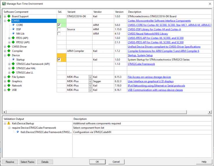 W pustym IDE klikamy następnie przycisk Manage Run-Time Environment (rysunek 5), zaś w otwartym w ten sposób oknie wybieramy potrzebne pakiety: CMSIS->CORE oraz Device->Startup (rysunek 6).