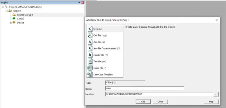 Program będzie starał się przekonać nas, że konieczny jest jeszcze komponent STM32CubeMX, jednak jako rasowi niskopoziomowcy nie będziemy korzystać z graficznego generowania konfiguracji peryferiów. Zatwierdzamy wybór przyciskiem OK, a następnie klikamy prawym klawiszem myszy pozycję Source Group 1 w lewym panelu Project, co spowoduje otwarcie menu kontekstowego. Klikamy opcję Add New Item to Group (…), otwierając w ten sposób okno umożliwiające wybór rodzaju pliku. Wpisujemy nazwę main oraz wybieramy typ pliku C File (.c) (rysunek 7) i klikamy Add. Otwarty zostanie pusty plik tekstowy, w którym będziemy mogli rozpocząć pisanie naszego kodu.