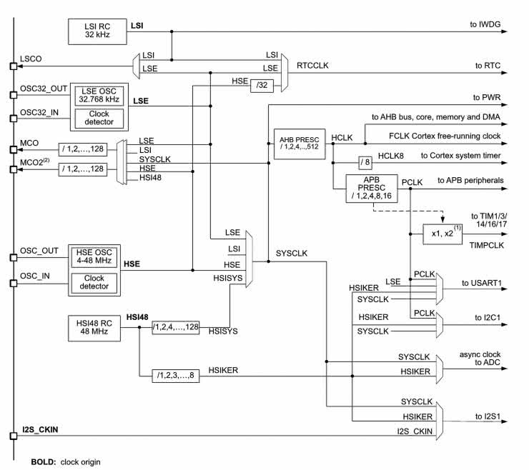 Nasz pierwszy program – tradycyjnie w przypadku kursów programowania mikrokontrolerów – będzie miał za zadanie migać diodą, znajdującą się na płytce Nucleo. Realizację tej funkcjonalności zaczniemy od skonfigurowania rejestru RCC (Reset and Clock Control), czyli bloku peryferyjnego odpowiedzialnego za dostarczanie sygnałów taktujących i obsługę różnych źródeł resetu mikrokontrolera. Schemat bloku RCC (a dokładniej – drzewo połączeń sygnałów taktowania) można zobaczyć na rysunku 12.