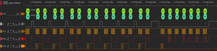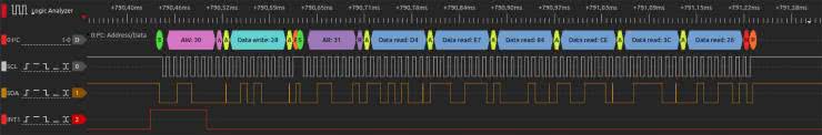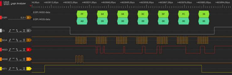 Na koniec wpisujemy nową wartość (1) do zmiennej globalnej drdy_flag, zadeklarowanej w pliku main.c. Teraz wystarczy już tylko proste sprawdzenie zawartości tej zmiennej w pętli głównej programu – jeżeli będzie ona ustawiona, program przeprowadzi odczyt danych z akcelerometru, resetując uprzednio flagę drdy_flag do wartości spoczynkowej równej 0. Na rysunku 18 można zobaczyć przebiegi, zarejestrowane za pomocą analizatora stanów logicznych – tym razem z dodatkowym, piątym kanałem, podłączonym do linii PA10.