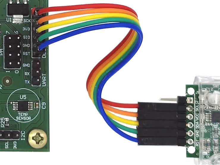 Prawidłowe podłączenie programatora MLink do złącza DBG płytki ewaluacyjnej pokazano na fotografii 2. Jak widać, skrajny „górny” pin wtyku goldpin interfejsu MLink (oznaczony literami CLK) należy pozostawić niepodłączony – dla ułatwienia w złączu DBG przewidziano odpowiadający mu styk, także niepodłączony do żadnego z sygnałów procesora. Wszystkie pozostałe linie są łączone w tej samej kolejności (w przypadku obydwu złączy). Do programowania można użyć kabla wielożyłowego (z izolacją wielokolorową lub jednobarwną) bądź zestawu pięciu przewodów żeńsko-żeńskich (z popularnymi wtykami typu DuPont/BLS).