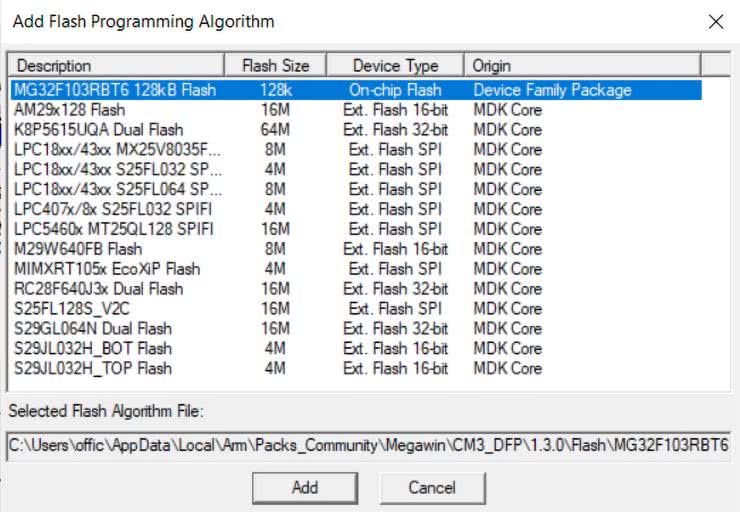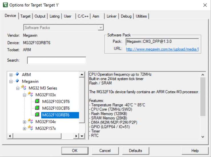 Tutaj musimy zmienić domyślny model procesora z MG32F103C9T6 na MG32F103RBT6 (rysunek 10).