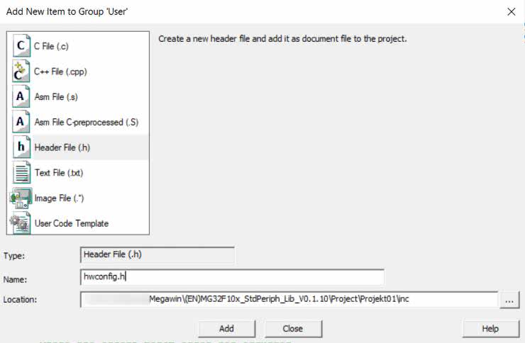 Po zatwierdzeniu możemy już utworzyć pusty plik źródłowy, klikając prawym klawiszem myszy folder wirtualny User (w drzewie projektu), następnie wybierając opcję Add New Item to Group ‘User’, a w dalszej kolejności Header File (.h) i – na sam koniec – wpisując nazwę pliku (np. hwconfig.h) w polu Name (rysunek 20). Plik należy umieścić w folderze inc. Teraz możemy już przepisać (lub – w celu zaoszczędzenia czasu – wkleić) odpowiedni kod (zamieszczony w materiałach źródłowych do niniejszego artykułu) do otwartego w ten sposób, pustego pliku w oknie edytora IDE. Plik automatycznie pojawi się w drzewie projektu.