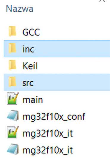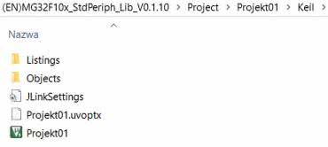 Pozornie najprostszą metodą na zduplikowanie szablonu byłoby przekopiowanie wspomnianego wcześniej folderu MG32F10x_StdPeriph_Template do wybranej przez nas lokalizacji i zmiana nazwy tak utworzonej kopii, np. na Projekt01. Ponieważ jednak w strukturze plików konfiguracyjnych projektu (tj. *.uvprojx oraz *.uvoptx, przechowujących wszystkie niezbędne ustawienia), podane są ścieżki względne do folderów bibliotecznych, taka operacja spowodowałaby, że Keil miałby problem ze znalezieniem odpowiednich plików. Dlatego też – dla ułatwienia – proponuję umieścić folder-kopię tuż obok oryginału. Wtedy wystarczy zmienić nazwę folderu oraz wspomnianych dwóch plików, podmieniając oryginalny ciąg znaków np. na Projekt01. Po wykonaniu tej operacji możemy otworzyć projekt, klikając dwukrotnie ikonę pliku Projekt01.uvprojx w oknie Eksploratora. Dla pewności warto spojrzeć na widoki zawartości poszczególnych folderów, zaprezentowane na rysunkach 7 i 8.