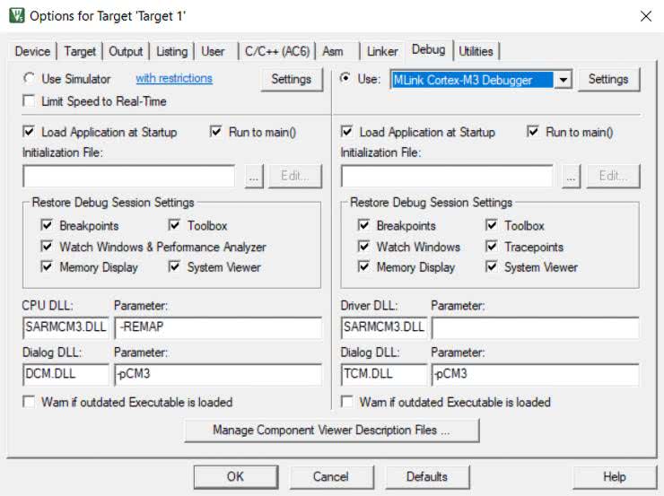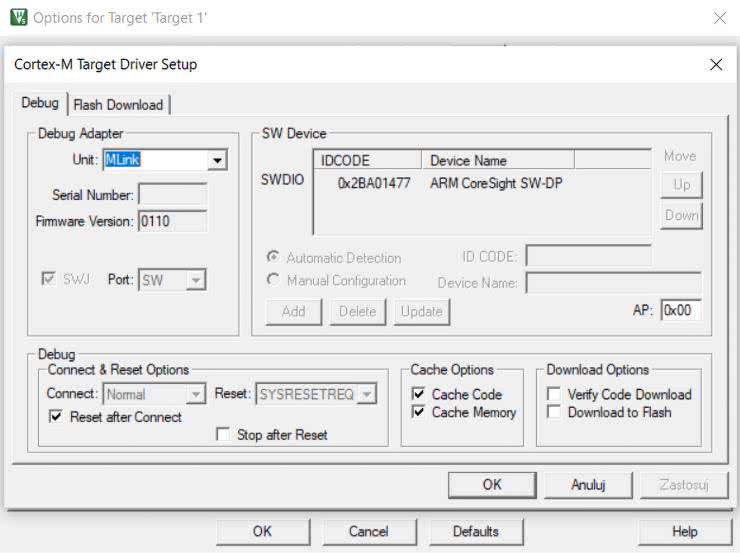 Po wykonaniu wszystkich opisanych powyżej operacji należy jeszcze przejść do konfiguracji interfejsu sprzętowego. W tym celu – w zakładce Debug – sprawdzamy, czy programator na pewno jest ustawiony na opcję MLink Cortex-M3 Debugger (rysunek 14). Należy przy tym zwrócić uwagę, by zaznaczone były opcje Load Application at Startup oraz Run to main().