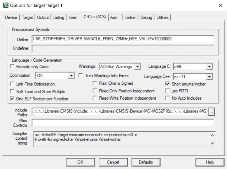 Bardzo ważne ustawienia czekają na nas także w zakładce C/C++ (AC6). Tutaj, w polu tekstowym Define (rysunek 13), możemy ustawić potrzebne wartości częstotliwości zegara systemowego oraz rezonatora kwarcowego, współpracującego z HSE. Ponieważ jednak na naszej płytce ewaluacyjnej rezonator XC1 ma częstotliwość 12 MHz, a w przypadku samego MCU chcemy pracować z domyślną, maksymalną częstotliwością 72 MHz, to możemy z czystym sumieniem pozostawić takie właśnie domyślne ustawienia szablonu. Warto natomiast przestawić poziom optymalizacji kompilatora na -O0.