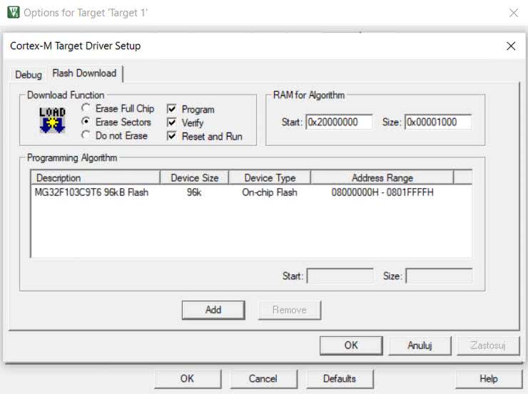 W tym momencie należy upewnić się, że zaznaczone są opcje Erase Sectors, Program oraz Verify, a następnie zaznaczyć domyślnie wyłączoną funkcję Reset and Run. Koniecznie należy także sprawdzić, czy w dolnej części okna widoczny jest algorytm wgrywania kodu maszynowego do pamięci procesora (Programming Algorithm). Jeżeli tak nie jest – należy kliknąć przycisk Add, a następnie wybrać opcję odpowiadającą naszemu mikrokontrolerowi (rysunek 17).