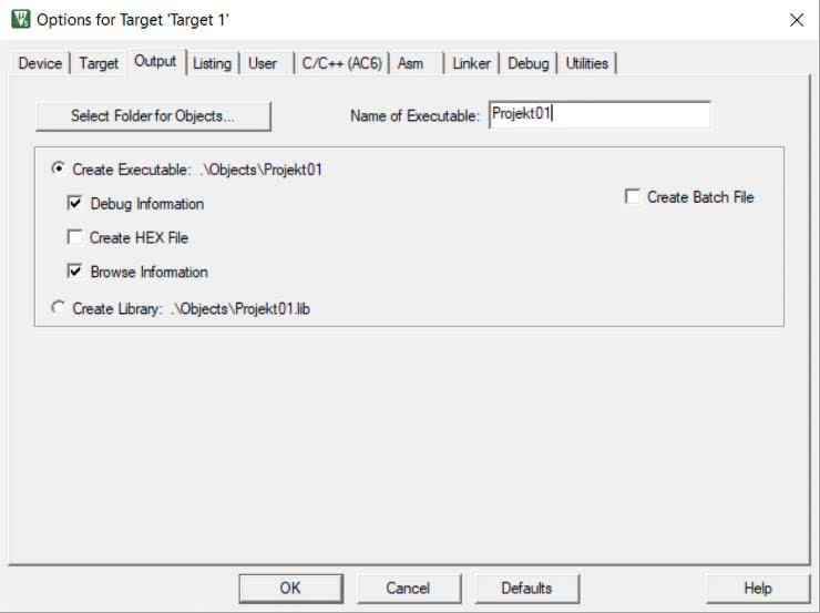 Jeżeli wszystkie dotychczasowe etapy zostały wykonane poprawnie, możemy skompilować nasz pierwszy program, klikając przycisk Build lub naciskając klawisz funkcyjny F7. O prawidłowym zakończeniu budowania pliku binarnego świadczyć będzie komunikat w konsoli Build Output: „.\Objects\Projekt01.axf” – 0 Error(s), 0 Warning(s).