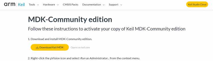 W celu pobrania środowiska Keil MDK należy wejść na stronę: keil.arm.com/mdk-community, a następnie założyć darmowe konto, używając swojego prywatnego adresu e-mail, na który wysłany zostanie kod weryfikacyjny niezbędny do przejścia do krótkiego formularza danych osobowych. Następnie, wracając jeszcze raz na stronę: https://www.keil.arm.com/mdk-community/ (rysunek 1), należy pobrać plik instalatora (rysunek 2).