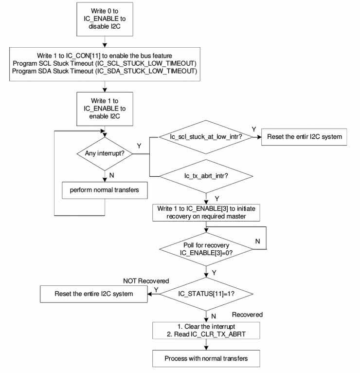 - SCL stuck at low timeout – liczba cykli sygnału taktującego, po upłynięciu których kontroler I²C ma wygenerować przerwanie, jeżeli linia SCL pozostaje przez cały czas zablokowana (tj. panuje na niej stan niski).