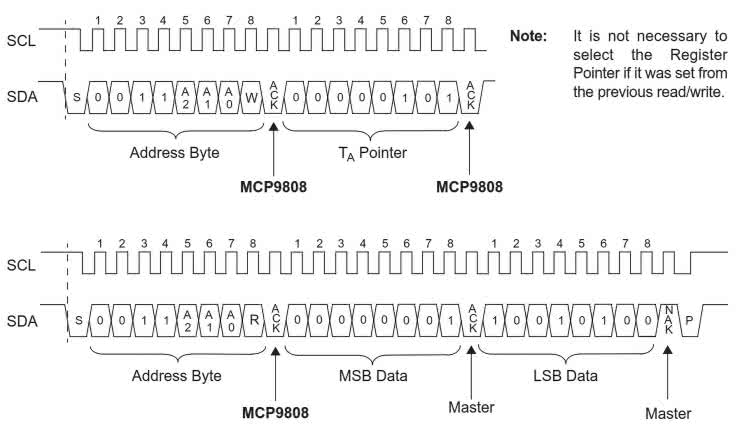 Dla ułatwienia nie będziemy zagłębiać się w tajniki konfiguracji i rozmaite funkcje dodatkowe sensora, skupimy się jednie na podstawowym odbiorze danych na temat zmierzonej temperatury. Po wysłaniu bajtu adresowego zakończonego bitem W (zapis) master powinien nadać adres rejestru, który w przypadku TA ma wartość 0x05.