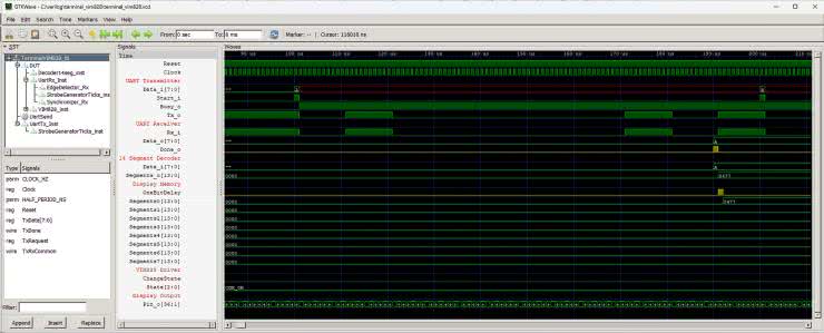 Wyjście Data_o odbiornika UART jest podłączone wprost do wejścia Data_i dekodera 14-segmentowego za pośrednictwem zmiennej RxByte w module TerminalVIM828. Widzimy, że odpowiedź dekodera pojawia się na jego wyjściu Segments_o w kolejnym takcie zegarowym. Jednocześnie w tym samym takcie pojawia się stan wysoki zmiennej OneBitDelay.