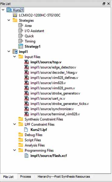 Utwórz nowy projekt i dodaj do niego pliki, które pokazano na rysunku 4. Wszystkie moduły, z wyjątkiem top, były już omawiane w niniejszym kursie. Znajdziesz je w repozytorium na GitHubie, dostępnym pod adresem [1]. Pamiętaj, że w drzewku projektowym plik vim828_defines.v musi znajdować się przed plikiem vim828.v. W razie potrzeby, kolejność plików możesz zmieniać, klikając i przeciągając je myszą we właściwe miejsce.