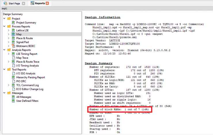 Otwórz raporty i wybierz raport Map. Zobacz rysunek 6. W miejscu zaznaczonym czerwoną ramką widzimy, że został użyty jeden blok pamięci EBR. Pamięć ta została użyta przez moduł Decoder14seg.