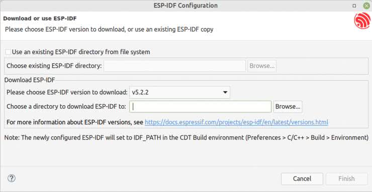 Zaznaczając opcję Use an existing ESP-IDF directory from file system możemy wskazać katalog z wcześniej pobranymi wersjami ESP-IDF. Jedną z nich będzie można ustawić jako aktywną i używaną w procesie kompilacji programów użytkownika. Jeżeli opcja pozostanie niezaznaczona, można wybrać wersję środowiska do pobrania z sieci spod adresu https://dl.espressif.com/dl/idf-eclipse-plugin/updates/latest/. Pliki wersji po pobraniu zostaną rozpakowane do wskazanego folderu i mogą być użyte jako aktywna wersja ESP-IDF.