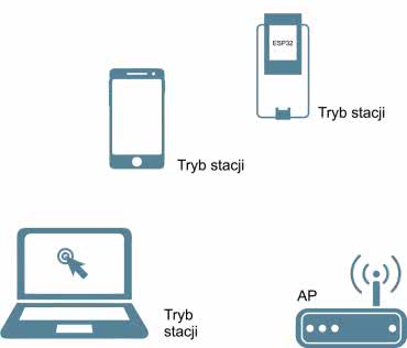 Praca w trybie stacji oznacza, że moduł ESP32 może po zalogowaniu łączyć się z innymi uczestnikami lokalnej sieci Wi-Fi. Jest to sytuacja pokazana na rysunku 2. Lokalną sieć tworzy w tym przykładzie router oraz dwa inne urządzenia działające w trybie stacji: komputer PC i telefon. Moduł ESP32, po uwierzytelnieniu się właściwym hasłem, otrzymuje swój numer IP przydzielony przez router. Od tego momentu staje się widoczny w ramach sieci lokalnej – może za pośrednictwem routera łączyć się z pozostałymi uczestnikami sieci i wymieniać dane. Prosty program pokazany na kolejnych listingach zademonstruje kroki niezbędne do tego, aby moduł – pracując w trybie stacji – stał się osiągalny w ramach sieci.