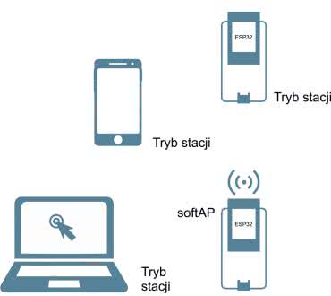 Tryb punktu dostępowego w dokumentacji nosi nazwę soft Acces Point (softAP). Pracując w tym trybie ESP32 tworzy lokalną sieć Wi-Fi, do której mogą się podłączać urządzenia będące stacjami Wi-Fi. Utworzona sieć umożliwia podłączonym stacjom komunikację i wymianę danych pomiędzy sobą, przy skorzystaniu z pośrednictwa softAP. Taką konfigurację zaprezentowano na rysunku 4. Trzy stacje: komputer PC, telefon oraz moduł ESP32 podłączone są do sieci utworzonej przez inny moduł ESP32, pracujący jako softAP.