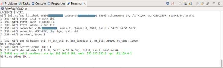 Po kompilacji programu i wgraniu do pamięci ESP32, układ zaczyna szukać sieci o podanej w stałej your_ssid nazwie i próbuje się do niej zalogować. W przypadku sukcesu nadawany jest modułowi numer IP. W monitorze można podejrzeć komunikaty generowane podczas tego procesu, podobne do tych widocznych na rysunku 3. Z komunikatu logu wynika, że router dodał moduł ESP32 pracujący w trybie stacji do sieci – i nadał mu numer IP 192.168.0.192.